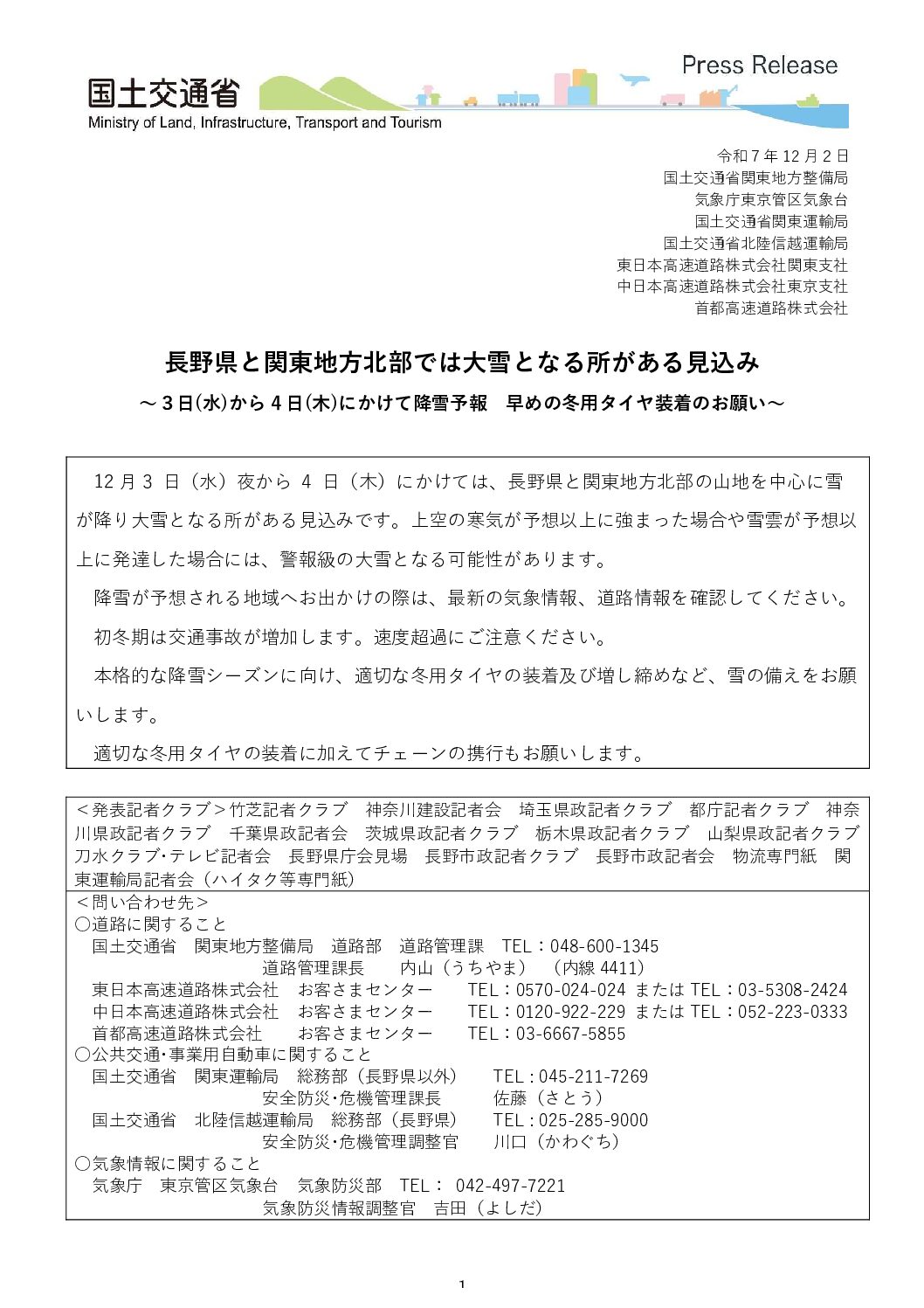 【事故警報】⻑野県と関東地⽅北部では⼤雪となる所がある⾒込み〜3⽇(⽔)から4⽇(⽊)にかけて降雪予報 早めの冬⽤タイヤ装着のお願い〜